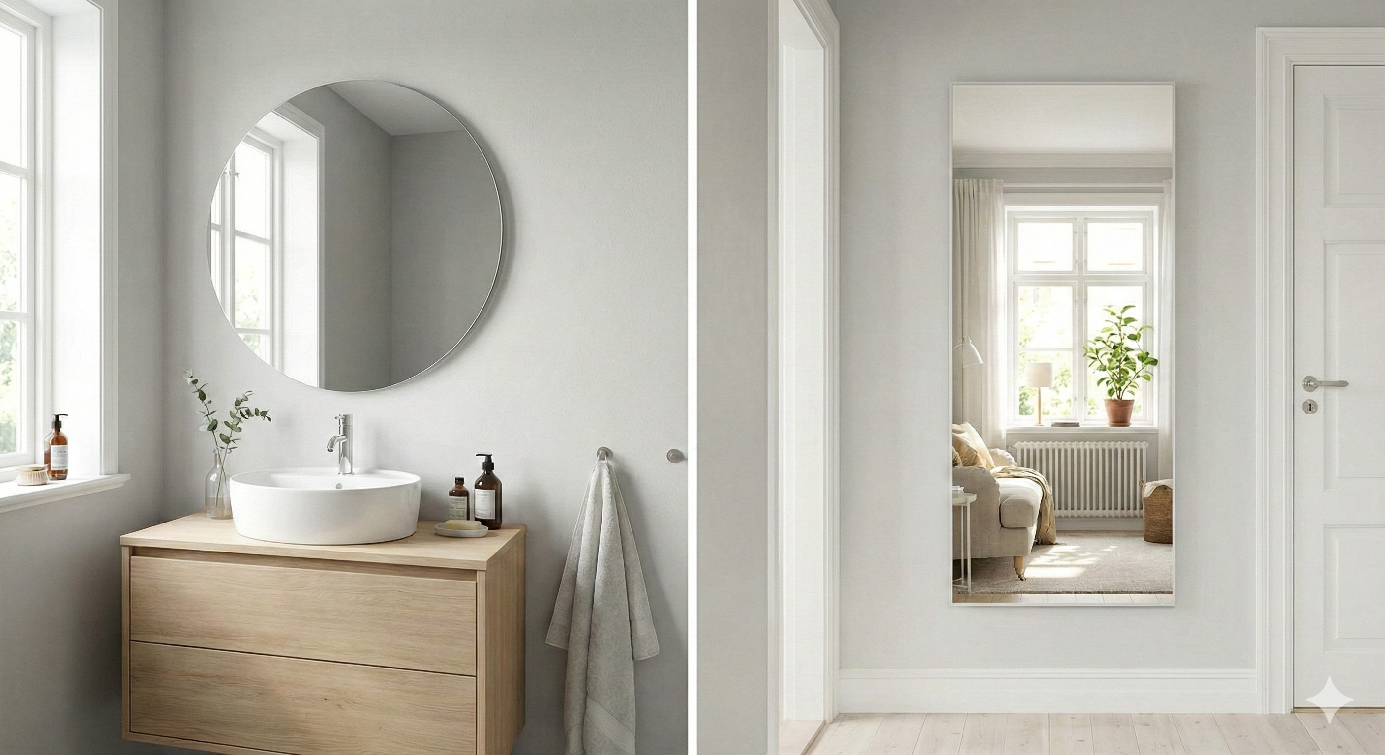 Regula generală este ca oglinda să nu fie mai lată decât lavoarul sau corpul de mobilier de sub ea. Ideal, oglinda ar trebui să aibă aceeași lățime cu lavoarul sau să fie cu 5-10 cm mai îngustă pe fiecare parte pentru un aspect echilibrat.